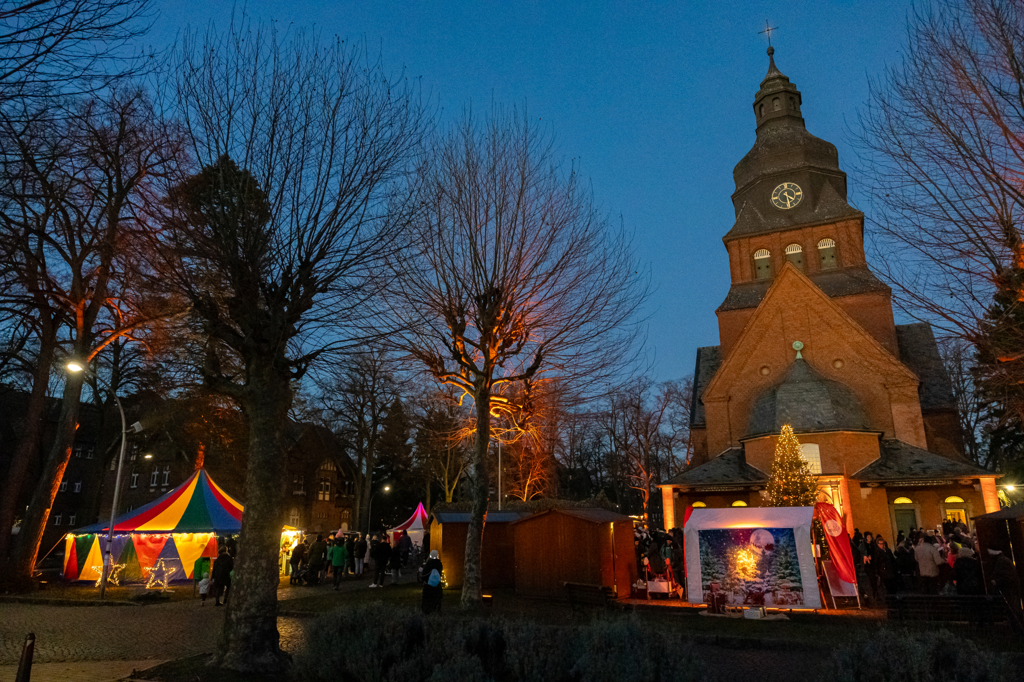 Ab 12.00 Uhr öffnet der Markt auf dem Lindenplatz und rund um die Kirche. An zahlreichen Ständen mit Kunstgewerbe, selbstgemachten Bastelarbeiten und vielem mehr können die ersten Weihnachtgeschenke erworben werden. Im Fest saal gibt es dieses Jahr ein kleines Angebot an Ständen sowie eine Kaffeestube. Auf der Bühne sorgen Raketen Erna, Bläsergruppen und Chöre für zauberhafte musikalische Unterhaltung und es können christliche Weihnachtstraditionen vom Adventskranz bis zur Weihnachtskrippe bestaunt werden. Zahlreiche Mitmach-Angebote für Kinder, Karussell und Schiff-schaukel zaubern ein nostalgisches Flair.